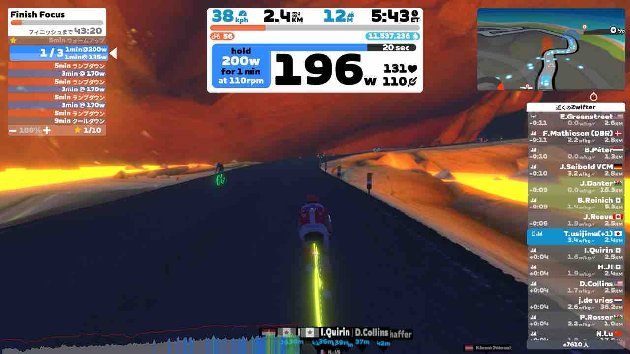 FTP強度の120%から徐々にランプダウンしながら、5分×4セットを繰り返します。