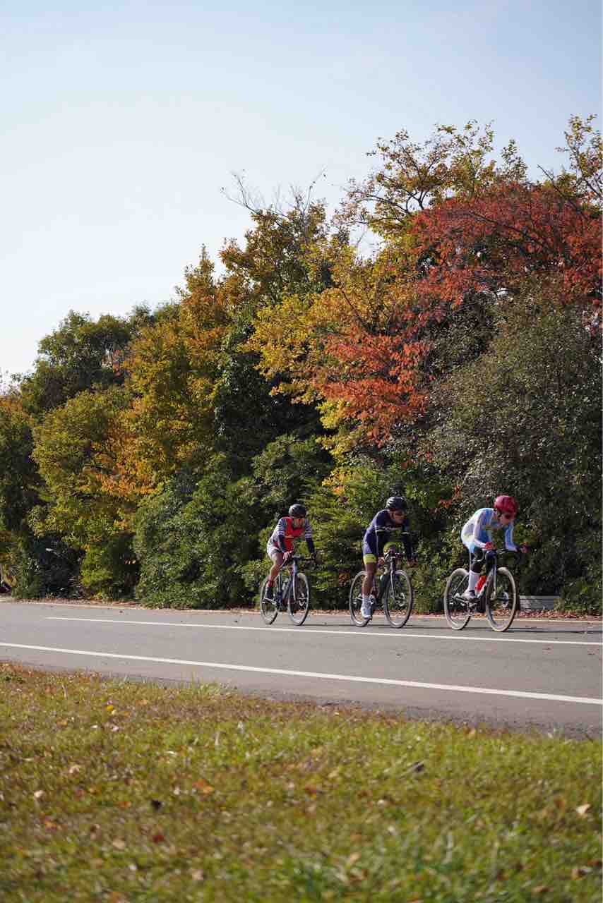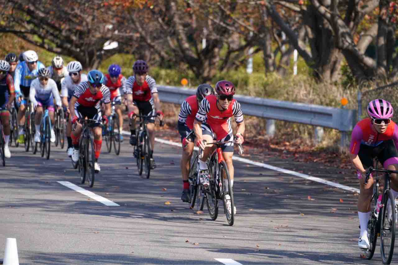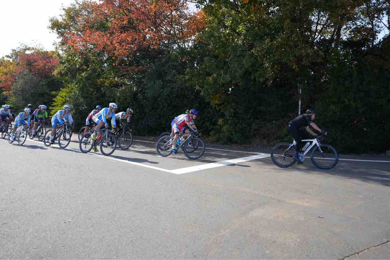 走りながら情報収集すると、逃げ集団にオーバー40、50カテゴリーの選手は入っていないのを確認する。